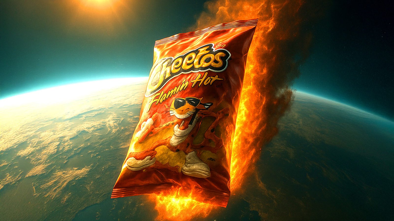 A flaming Hot Cheetos bag crashes into Earth like a meteor, snacks everywhere, people stunned. Pure 🔥