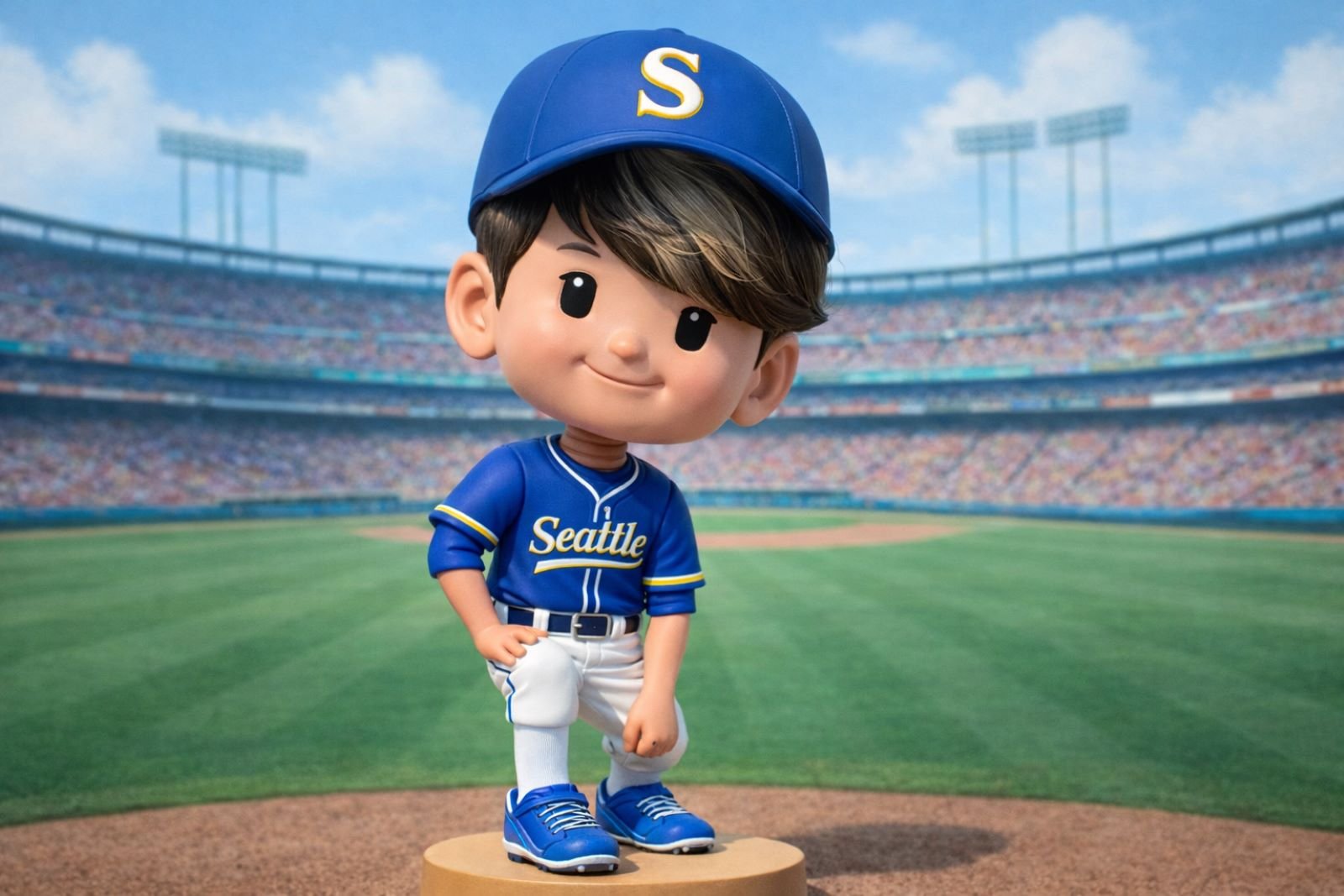 Transform the subject into a classic baseball bobblehead figurine that clearly reads as a manufactured collectible rather than a person. Dramatically oversize the head so it feels top heavy and playful, connected to the body by a short, stiff neck that suggests a spring instead of anatomy. Preserve the subject’s facial identity, but simplify the features and render the face as smooth matte painted vinyl skin with no pores or lifelike texture. Facial planes should feel simplified and graphic, with minimal surface detail. Hair and beard should appear fully sculpted, formed with carved grooves and solid shapes rather than individual strands. Dress the figure in a baseball uniform inspired by the colors of the subject’s original clothing or local geography, translated into a cohesive jersey, cap, and accessories. The body should be small, rigid, and toy like. Place the figurine in front of a printed or softly illustrated baseball stadium backdrop so the scene reads as a collectible display, nostalgic and unmistakably a bobblehead. Do not include a name on the figurine.