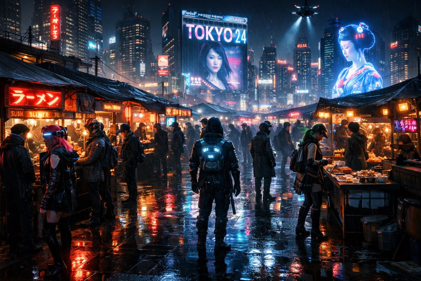 Generate a cinematic concept scene showing a futuristic rooftop market in Tokyo at night, neon lights reflecting off wet pavement, crowds of diverse characters in cyberpunk fashion, dramatic lighting, wide dynamic range.