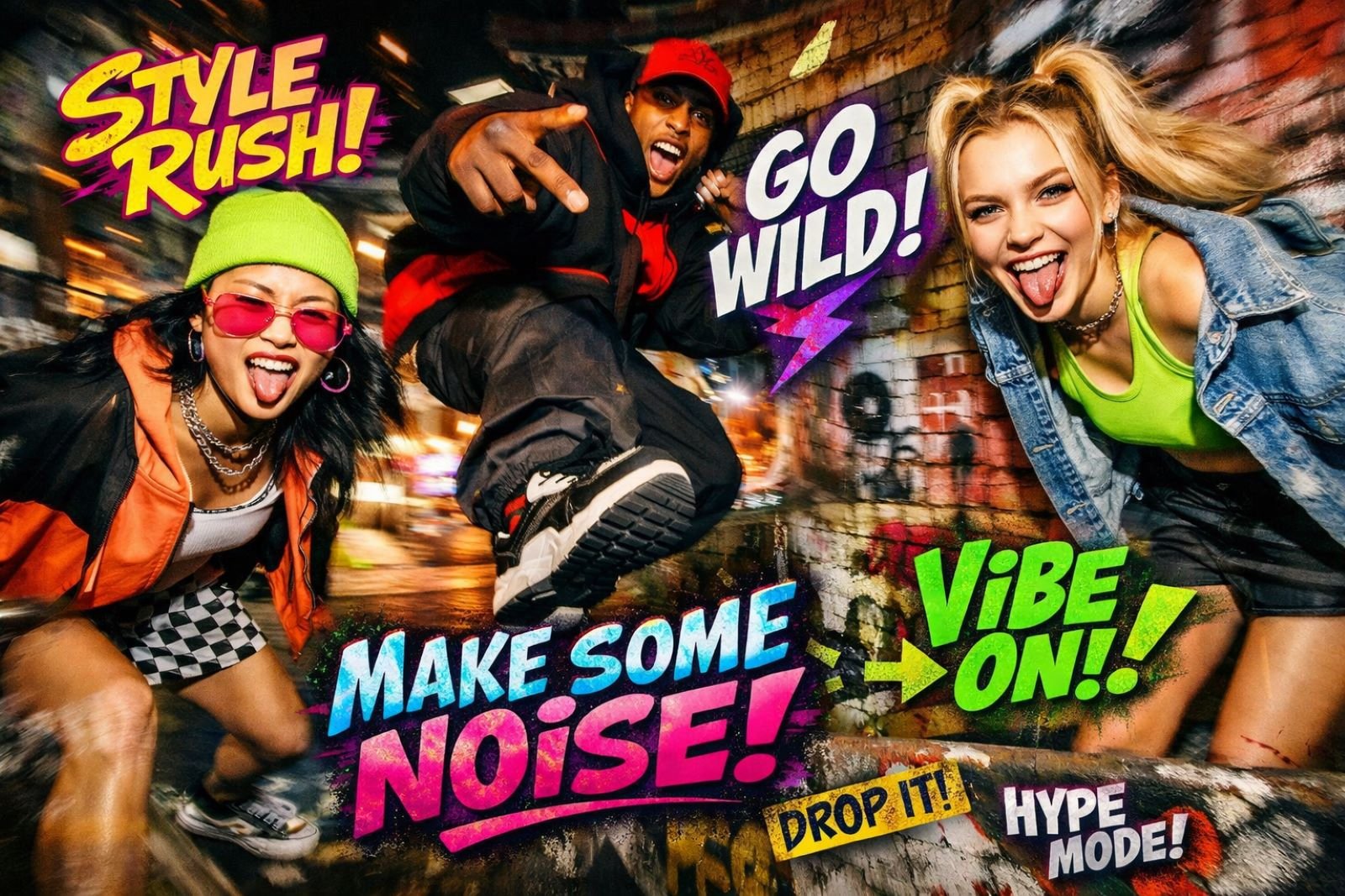 Design a bold, high-energy brand campaign visual for a Gen-Z streetwear brand. Vibrant colors, expressive motion blur, diverse models, playful typography space, raw urban textures, flash photography style. 16×9