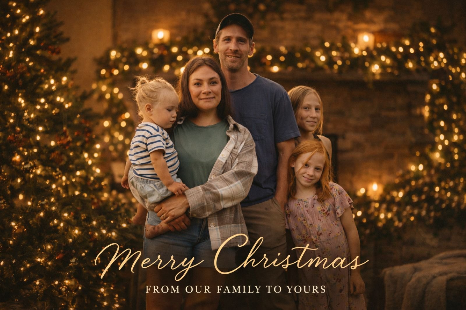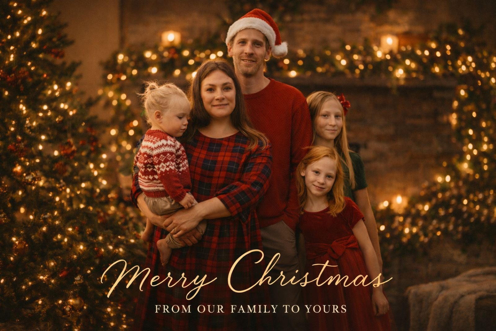 Transform the reference photo into a warm, elegant holiday card with festive styling, cozy lighting, subtle décor, and natural, photorealistic likeness preserved. Optionally include tasteful holiday text or a short seasonal greeting that complements the image without overpowering the subject.