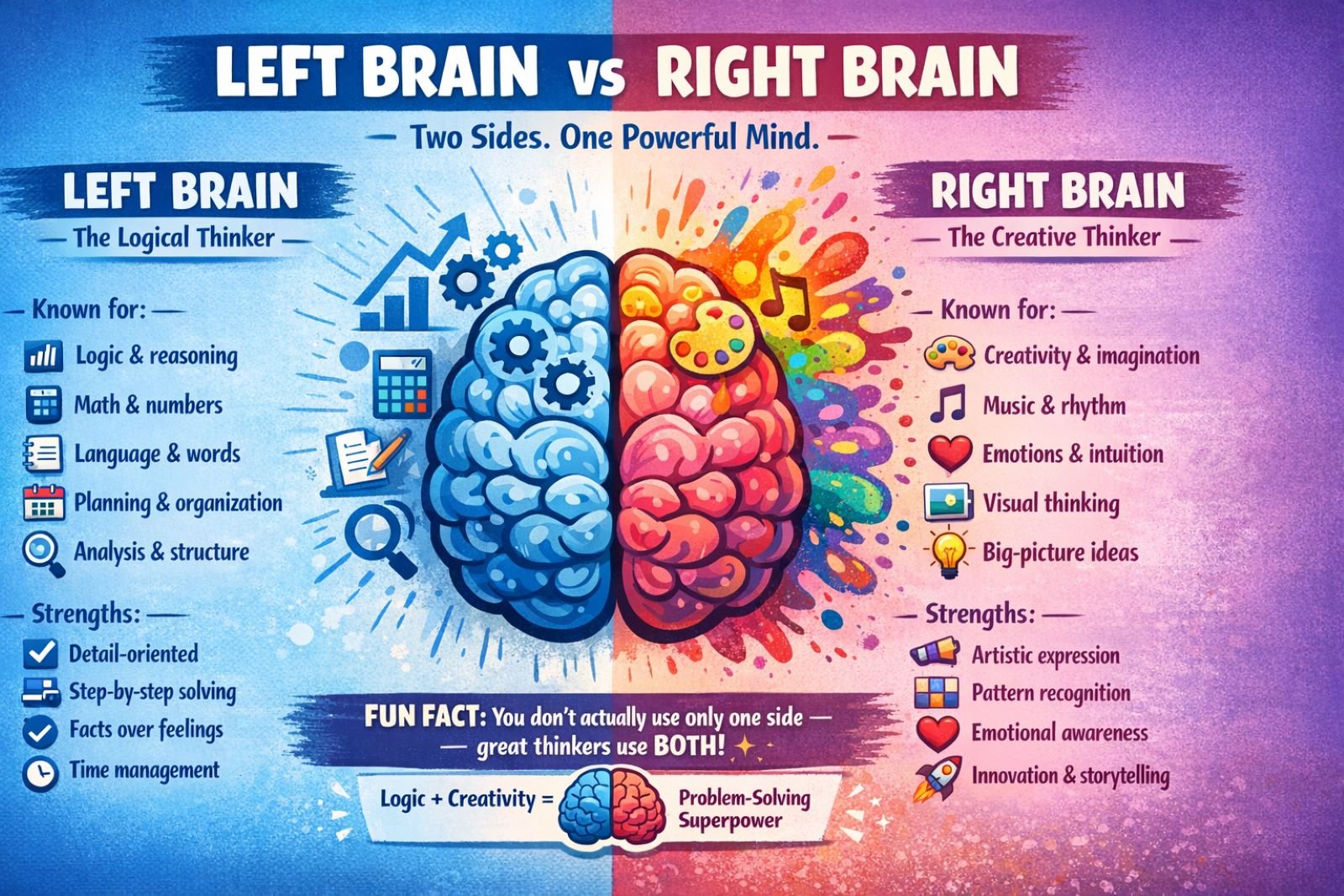 Create a fun and informative infographic on the Left Brain vs Right Brain differences. 16×9