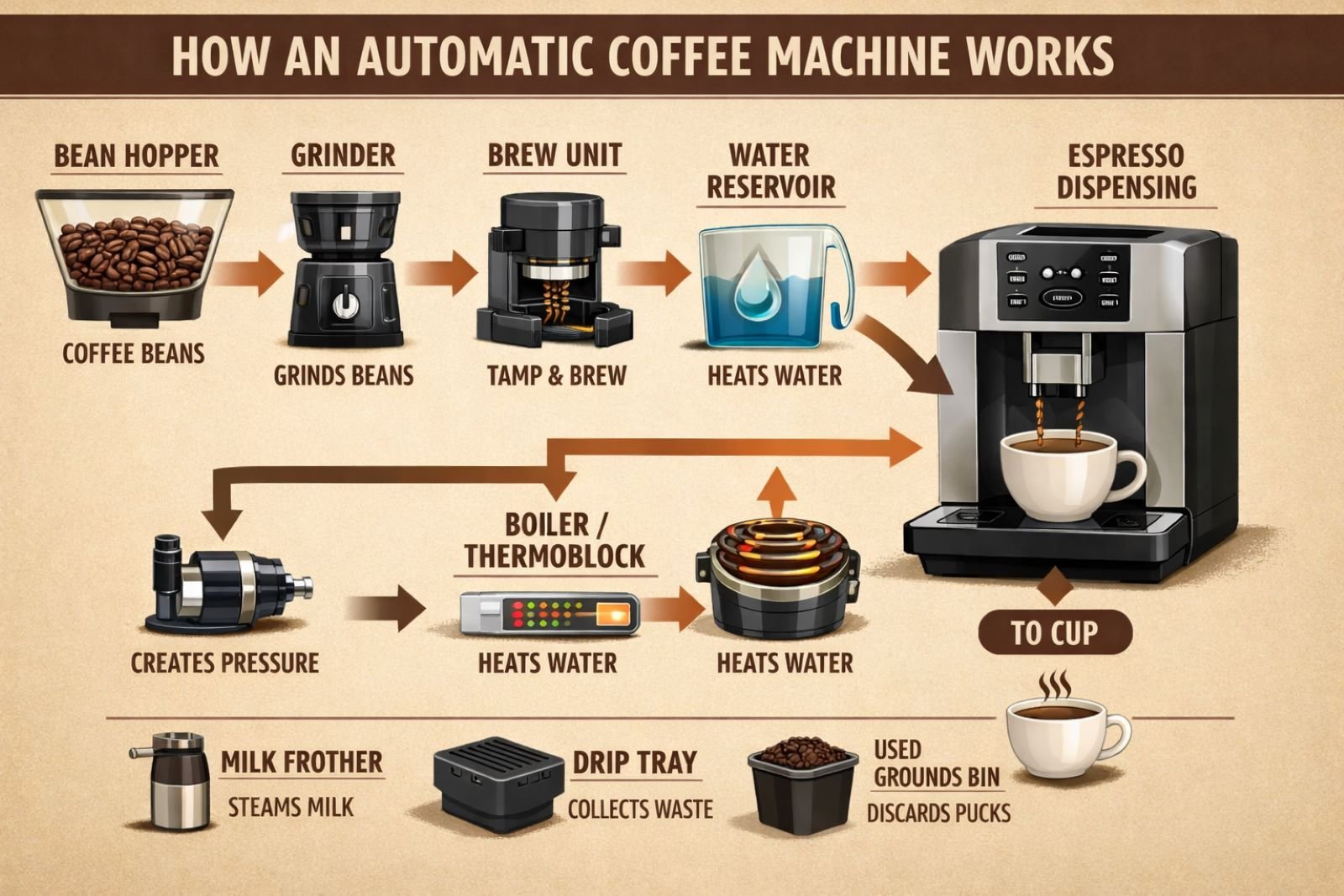 Design an infographic showing how an automatic coffee machine works — from beans to cup — labeled parts with icons and arrows. 16×9
