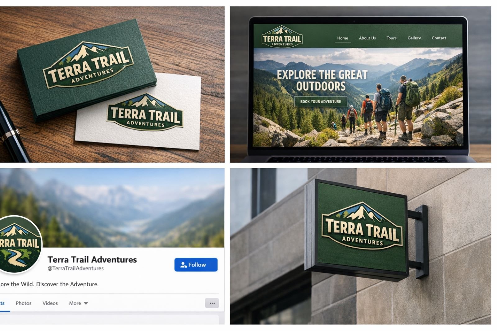 Create a realistic brand mockup for the Terra Trail Adventures brand: business cards, website header, social media avatar, signage. Consistent lighting and perspective. 16×9