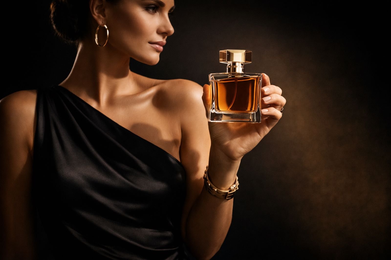 Close-up shot of the woman holding the perfume bottle close to her body, clearly displaying the bottle towards the camera. 16×9.