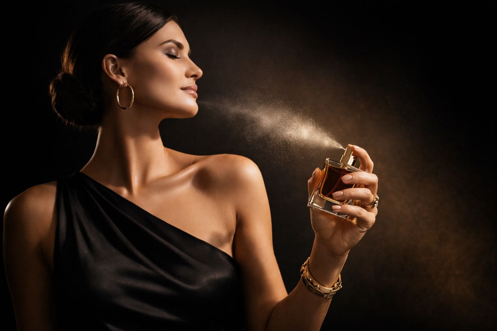 Create an image of the woman spraying the perfume towards herself, mid spray. She is savoring the elegant smell of the perfume. high-end photography, fashion shoot. 16×9