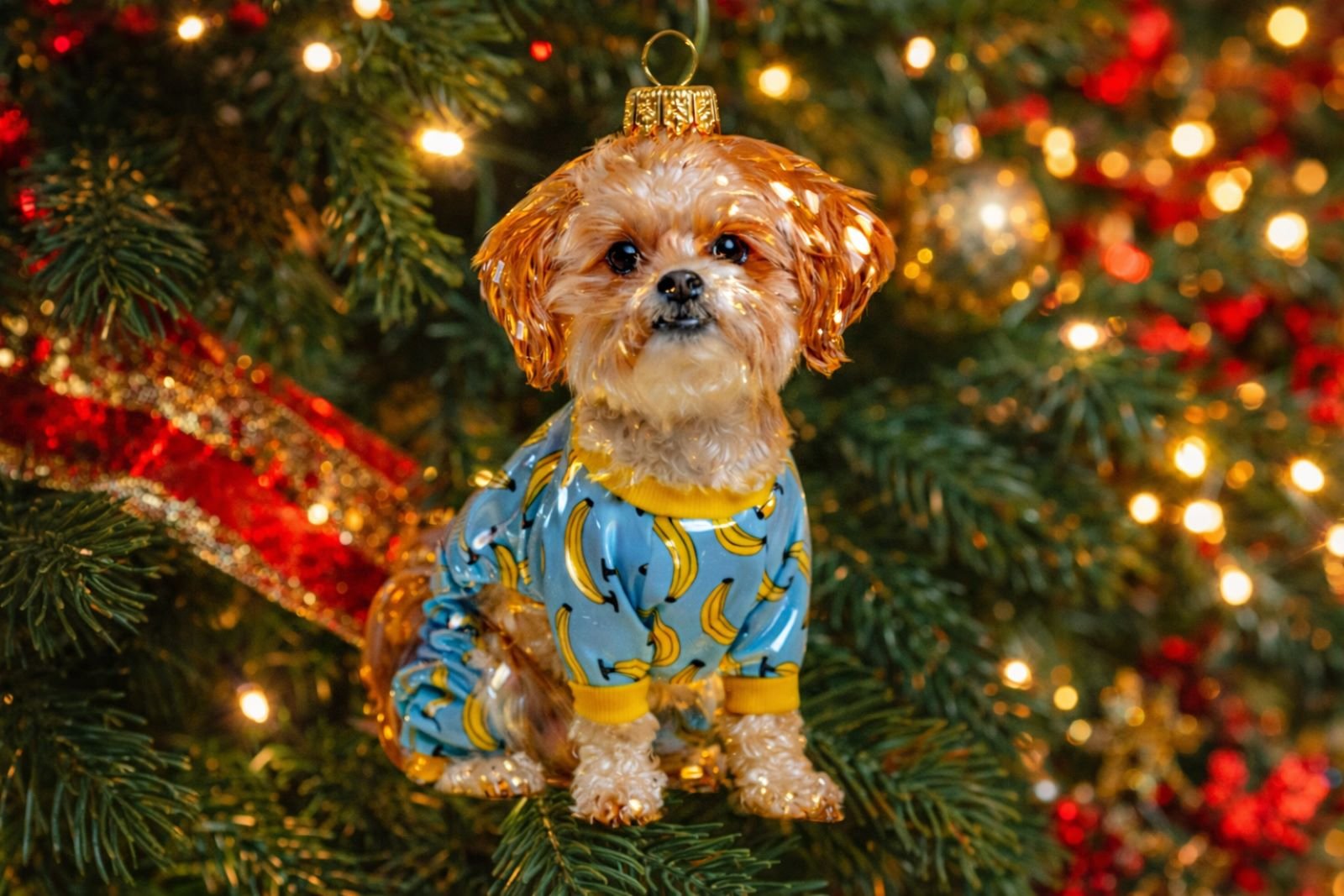 Turn this into an ornament sculpted from glossy molded glass, finished in a high-shine lacquer that catches light from every angle. Its surface feels perfectly smooth and cool, with a weight that suggests fragility and permanence at once. The coating is a lustrous enamel, somewhere between ceramic and a candy shell—reflective enough that small highlights bloom across its curves like soft sparks. Include a visible metallic ornament topper and attachment loop placed directly on the very top center of the person or object, aligned on the vertical axis. The topper should be clearly visible, emerging cleanly from the top and designed for hanging without disrupting the overall form. Make the background color similar to the input image. Place it on a christmas tree, with a festive holiday atmosphere.