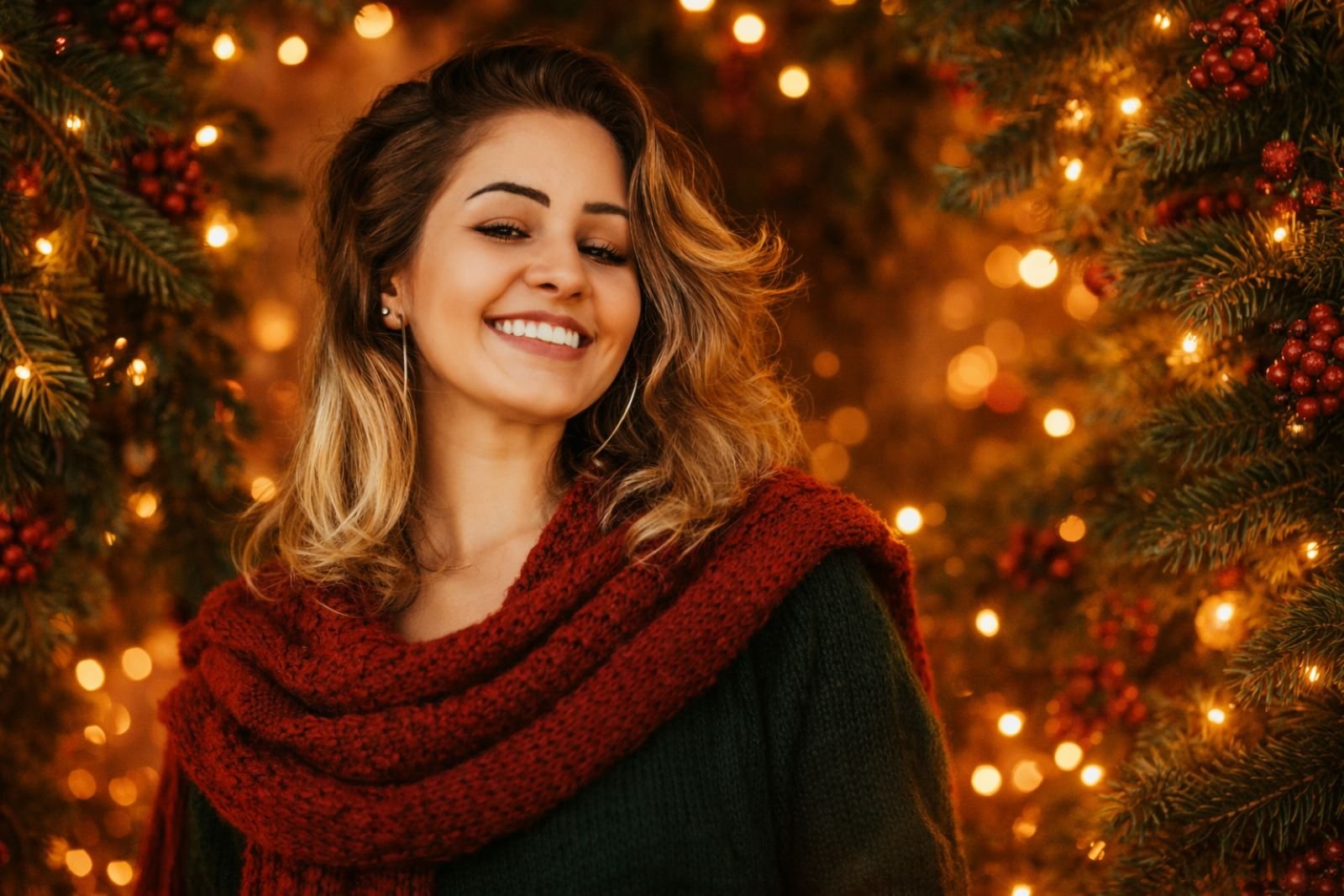Transform the uploaded photo into a warm, polished Holiday portrait. Keep the person’s REAL face, skin tone, expression, and features exactly the same. Restyle them in soft holiday lighting with gentle golden highlights. Surround them with festive elements like evergreen branches, warm twinkle lights, and a subtle bokeh glow. Add rich reds, forest greens, and cozy textures reminiscent of classic holiday cards. The final image should feel elegant, warm, and timeless — not cartoonish.