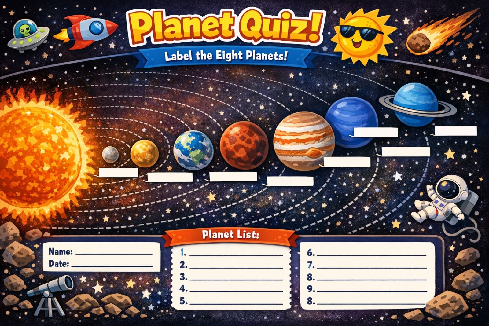 Create an image of a worksheet I can use to quiz my sixth graders on planets? Use a solar system map that they can label. 8 planets. Make it fun and visually appealing! 16×9