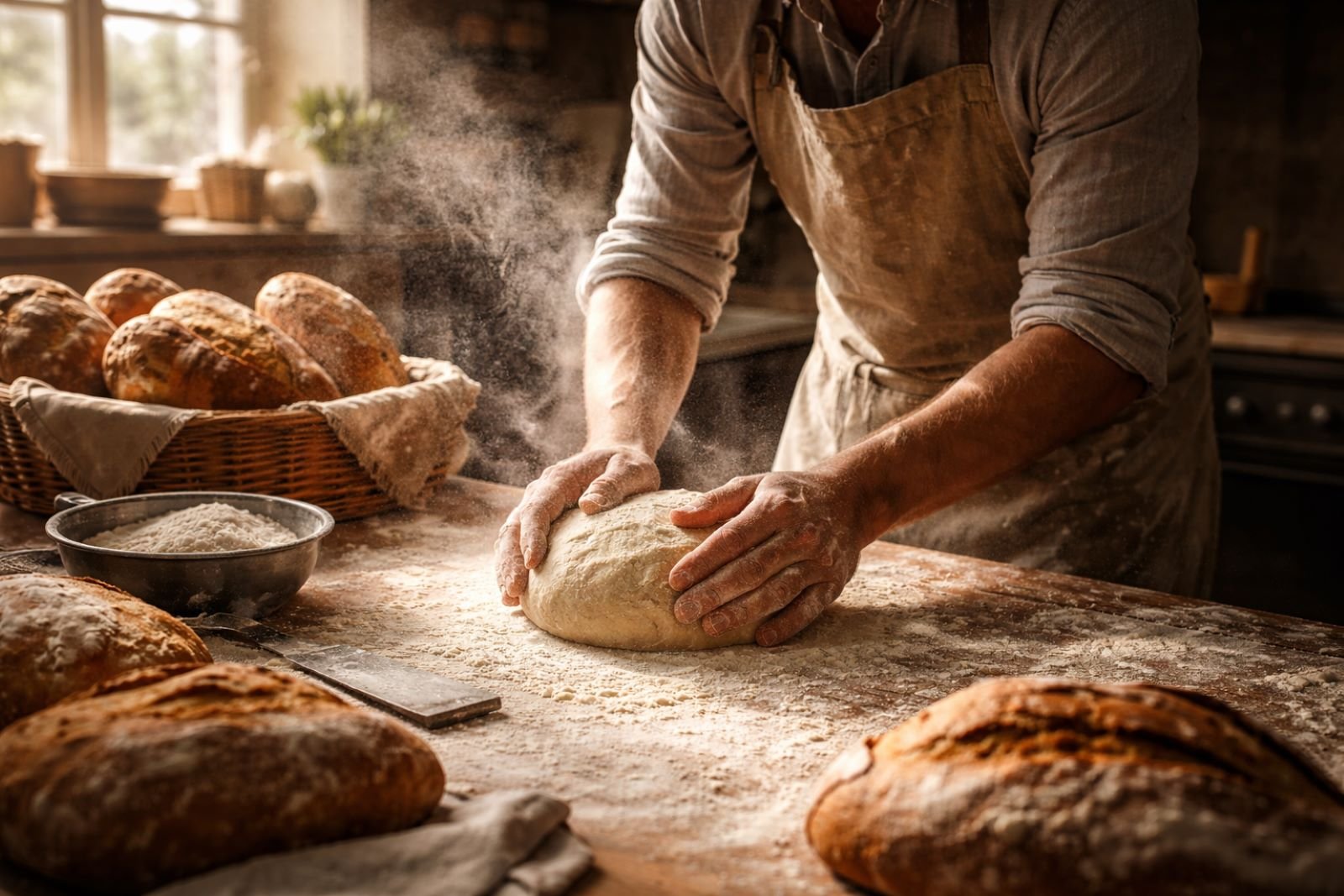 A photorealistic image of an artisan baker shaping sourdough in a rustic kitchen with morning sunlight. Focus on flour dust in the air, textures of crusty bread, natural shadows.