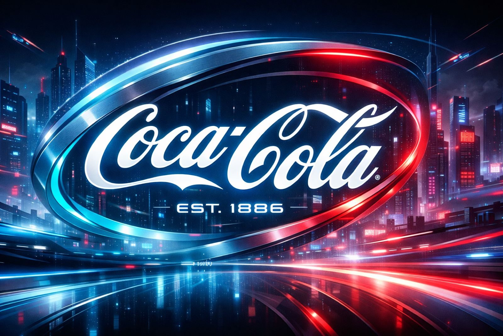 Reimagine the Coca-Cola brand as a futuristic version of itself in 2035. Keep core identity but update visual language, colors, and aesthetic for the future. 16×9