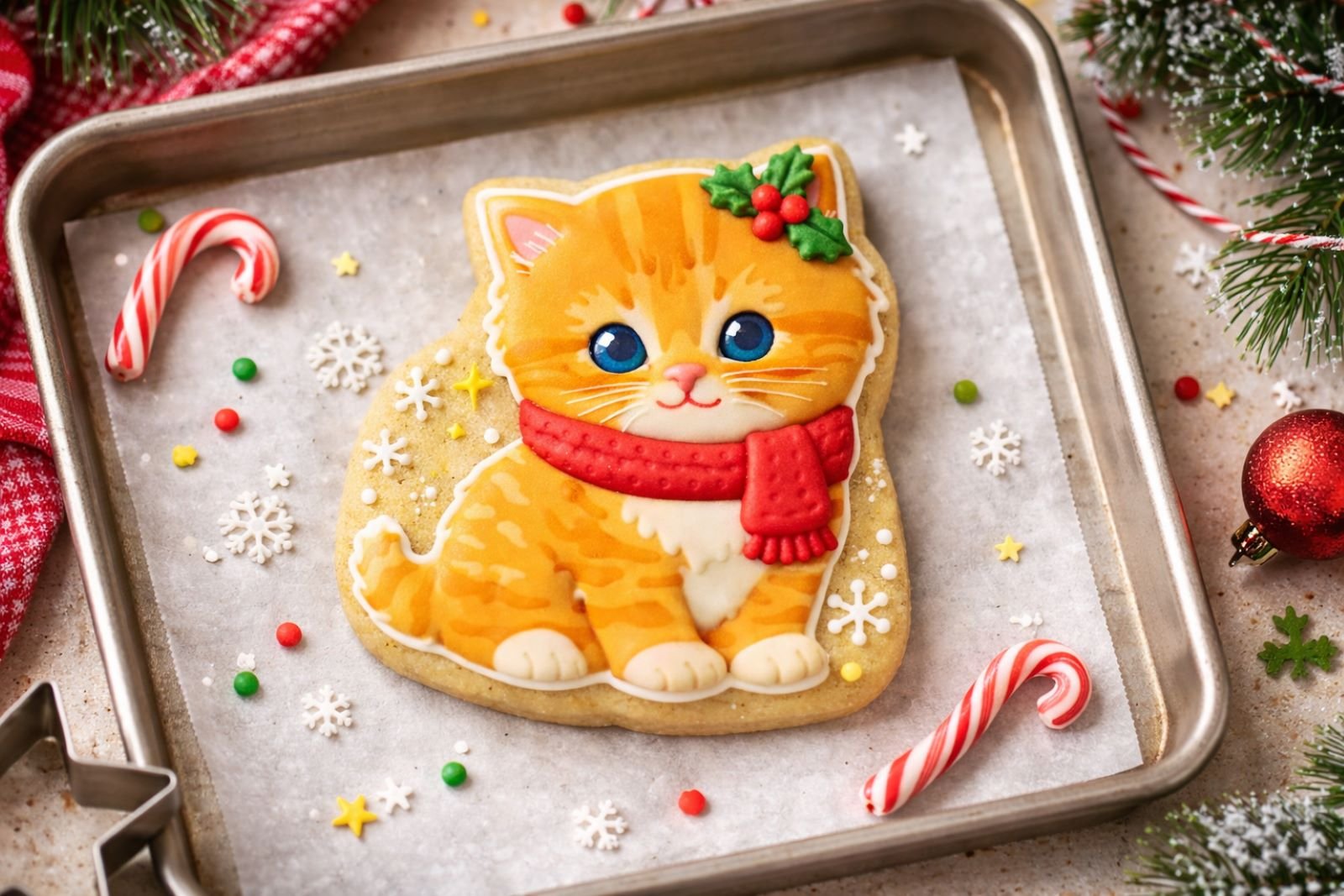 Using the provided image as reference, create a tasty, perfectly formed sugar cookie decorated with smooth royal icing based on the subject or image. If the image contains a person, render a simplified icing likeness of their face that clearly resembles them while remaining non-photorealistic; if the image contains an object, animal, or scene, translate its most recognizable features into a friendly royal-icing design using the same logic. The cookie should be stamped in a simple, easy-to-cut silhouette, with the design piped entirely in feasible royal-icing shapes—chunky, smooth lines rather than fine illustration detail, minimal shading, and clean, confident outlines like those used by a skilled cookie artist. Colors should be vibrant, playful, and holiday-friendly without needing to follow real-world color accuracy. Add small, simplified seasonal accents such as holly, snowflakes, sparkles, a scarf, or a beanie rendered as basic piped shapes, avoiding anything overtly religious or denominational. The final result should feel cute, approachable, and clearly edible, emphasizing handcrafted charm, clarity, and a strong resemblance achieved through simplified, piped decoration rather than realism. Place it on a baking sheet with a festive holiday background. 16×9