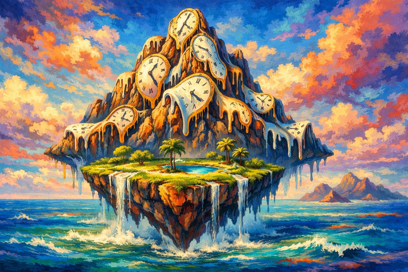 Illustrate a surreal mountain made of melting clocks above a floating ocean island, in a vividly colorful painterly style. 16×9