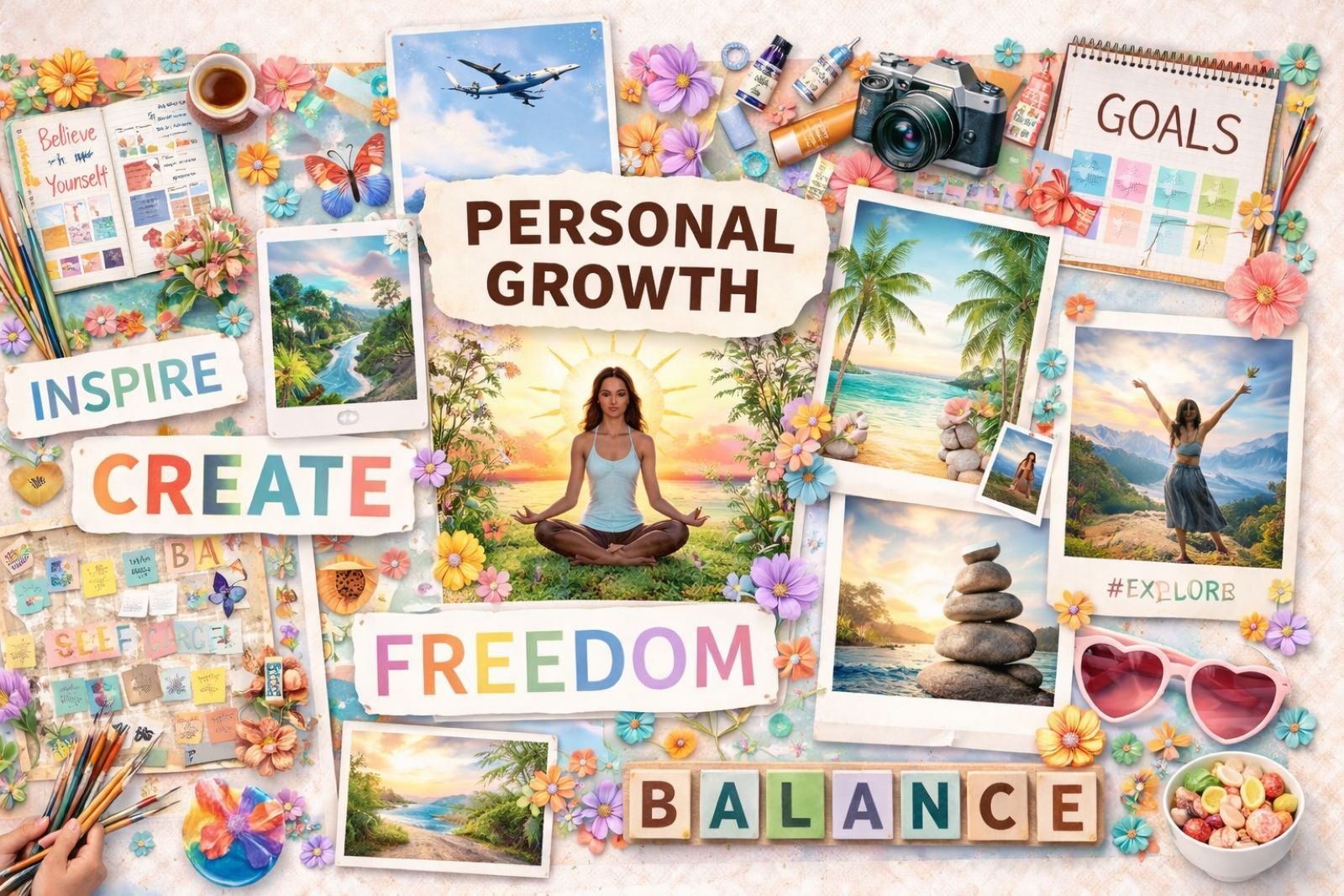 Create a visual vision board representing personal growth, creativity, freedom, and balance. Clean collage style.