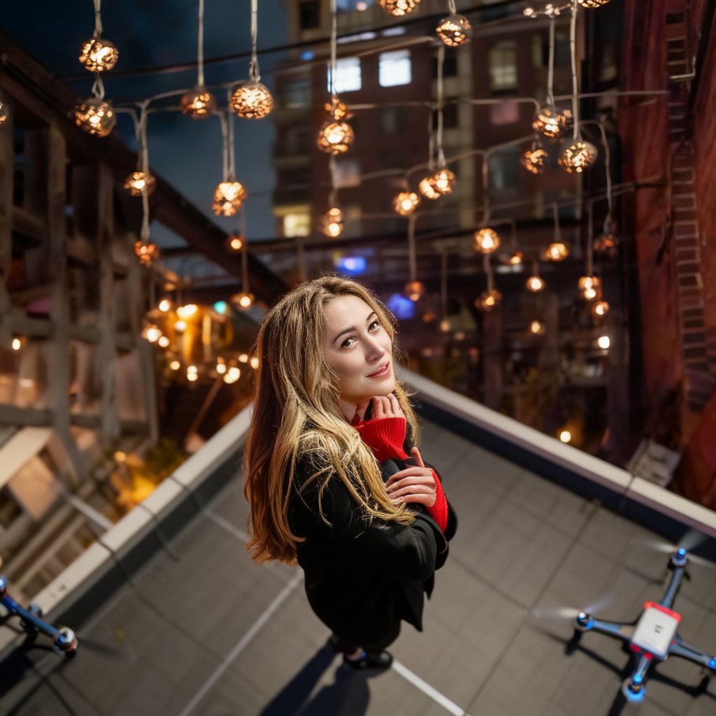Nano Banana nailed this test. It delivered a true aerial drone perspective, shifting the camera angle so the subject looks directly upward into the lens, exactly matching the request. The framing feels natural, and the perspective creates a convincing overhead shot. Seedream 4.0, however, struggled—it added a literal drone into the frame and kept the angle closer to eye-level, which broke the illusion of a proper drone shot. Nano Banana fully understood the cinematic camera control here, while Seedream failed completely.