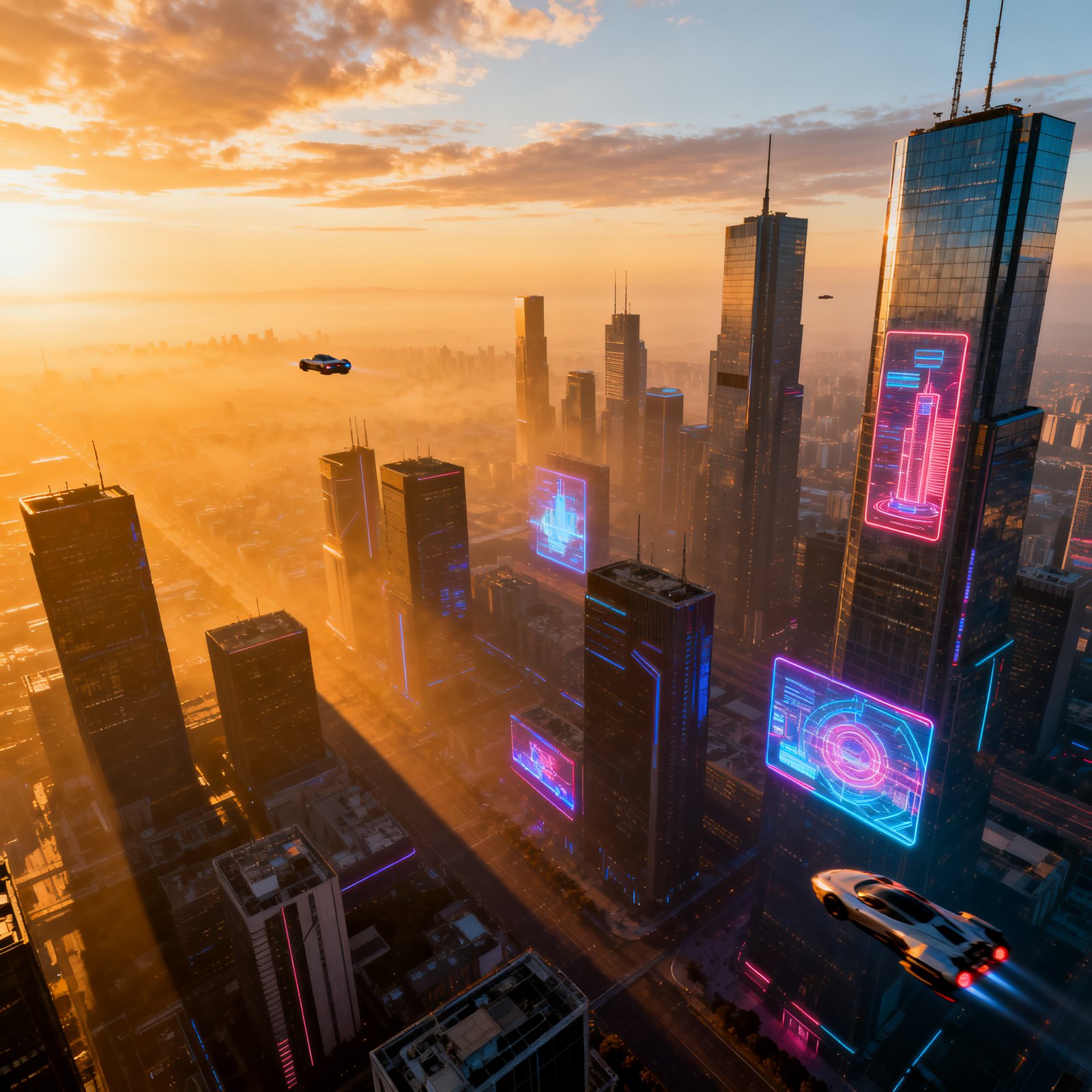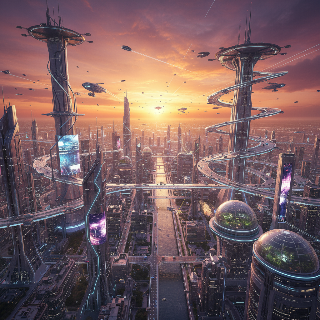 A futuristic city skyline, cinematic wide shot, drone aerial view at sunset