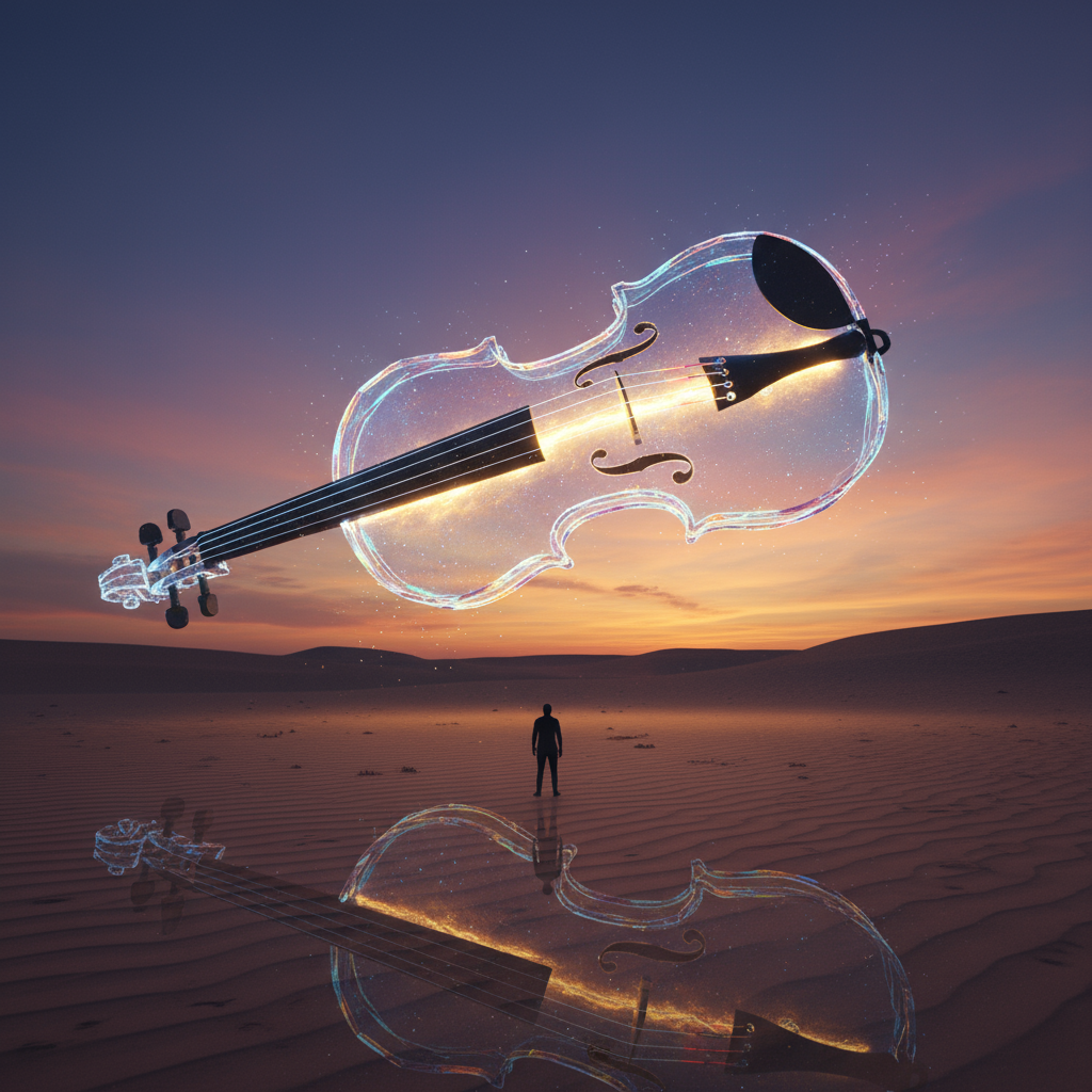 A giant violin made of glass floating in the desert, glowing with internal light, cinematic realism.