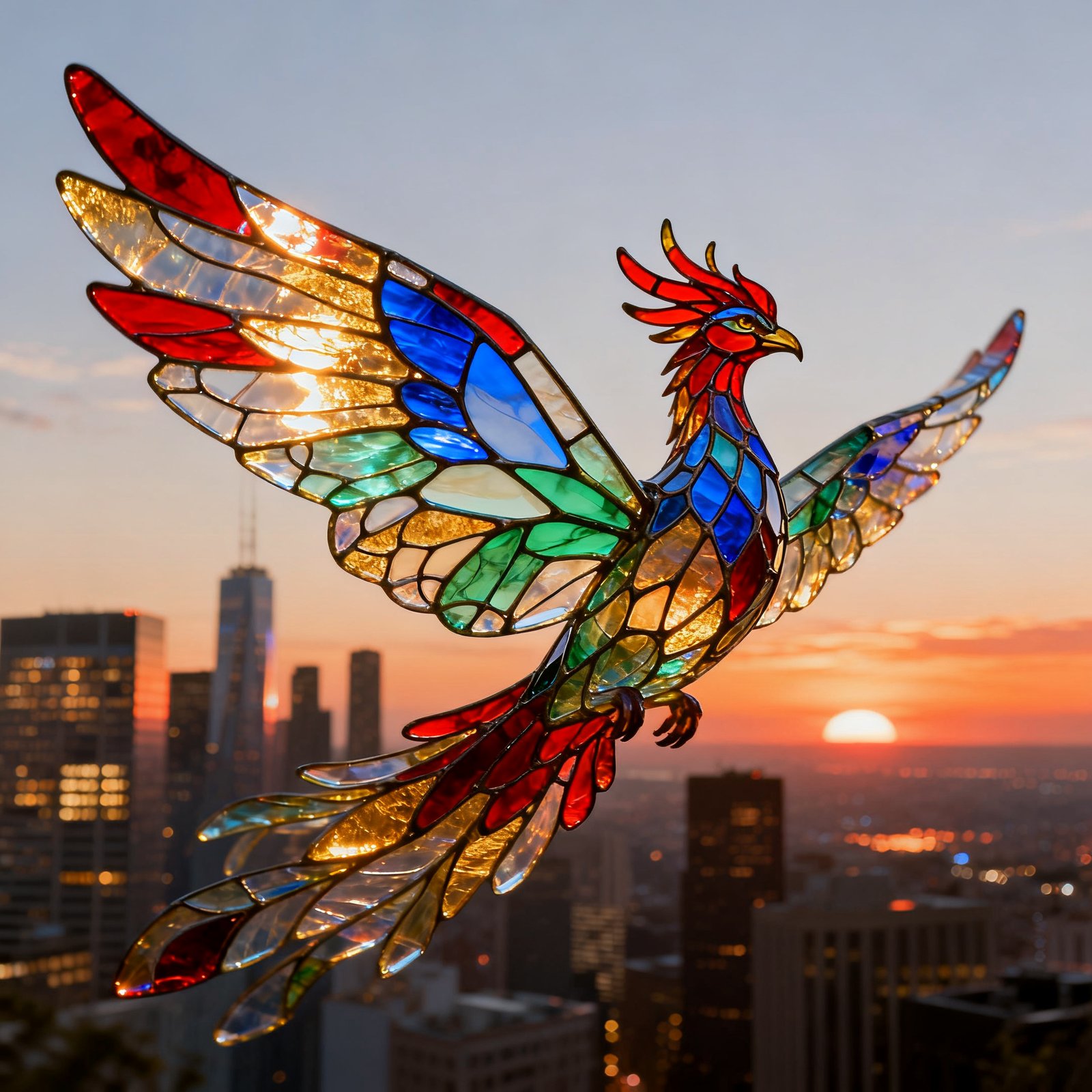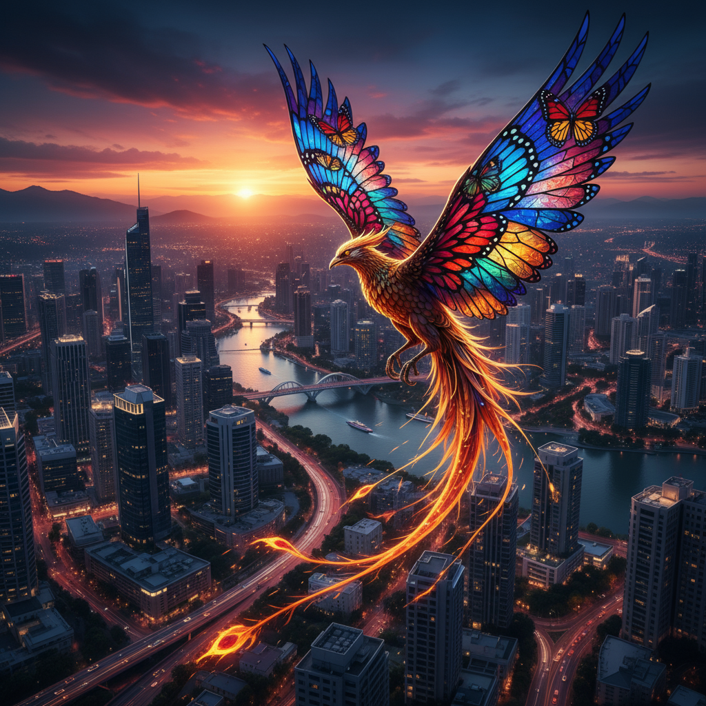 A phoenix with butterfly wings made of stained glass flying over a city skyline.