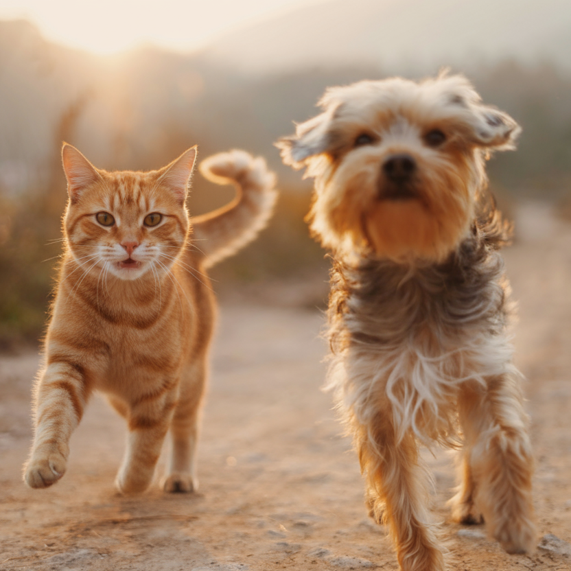 Replace the dog on the left with an orange-striped cat