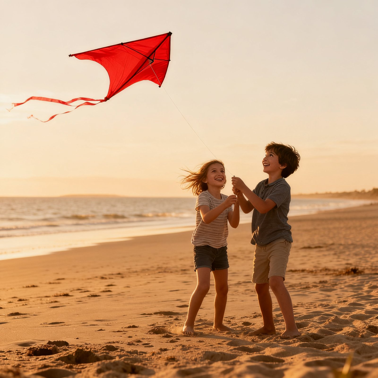Two children are flying a red kite together on the beach.