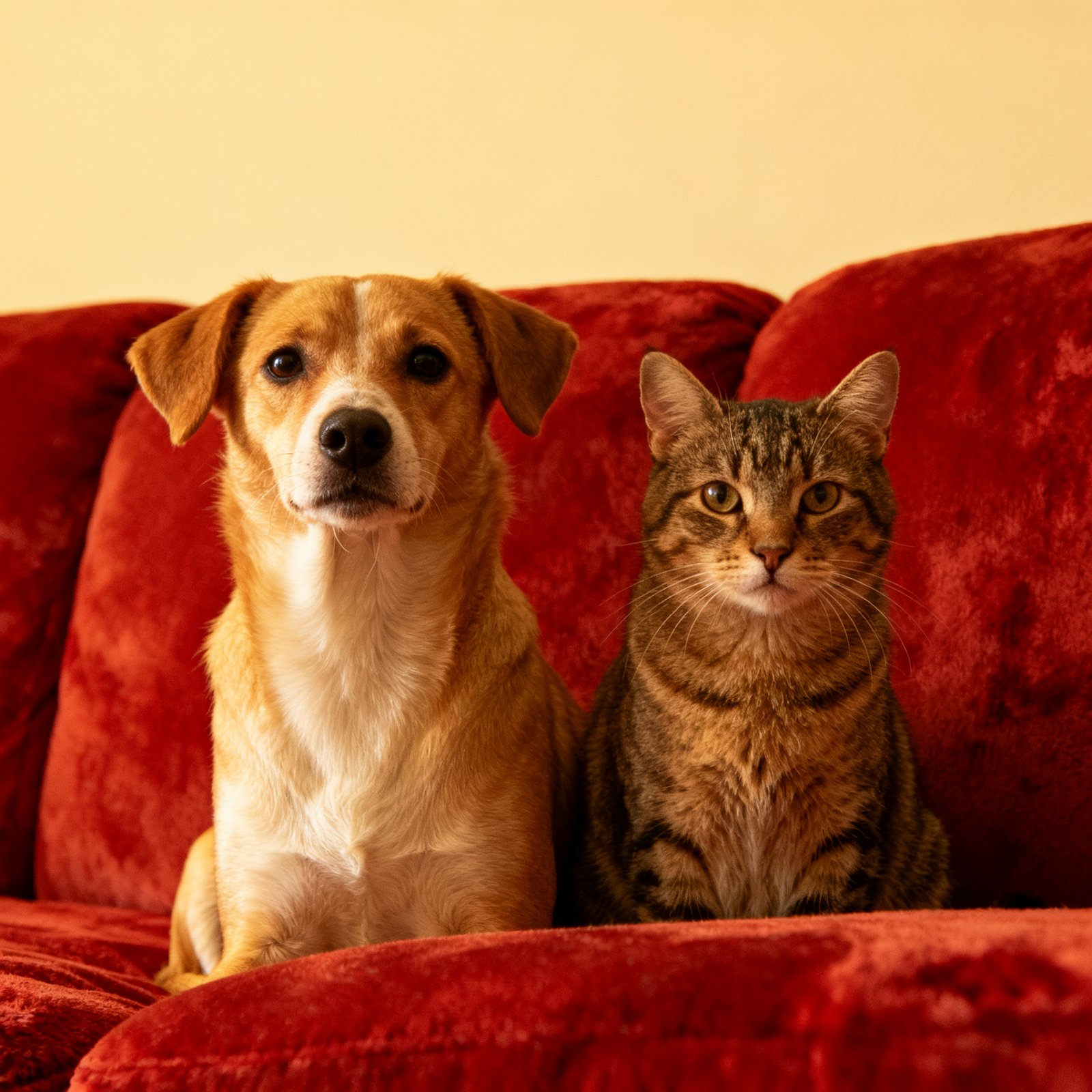 A dog and a cat are sitting side by side on a red couch, both looking at the camera.