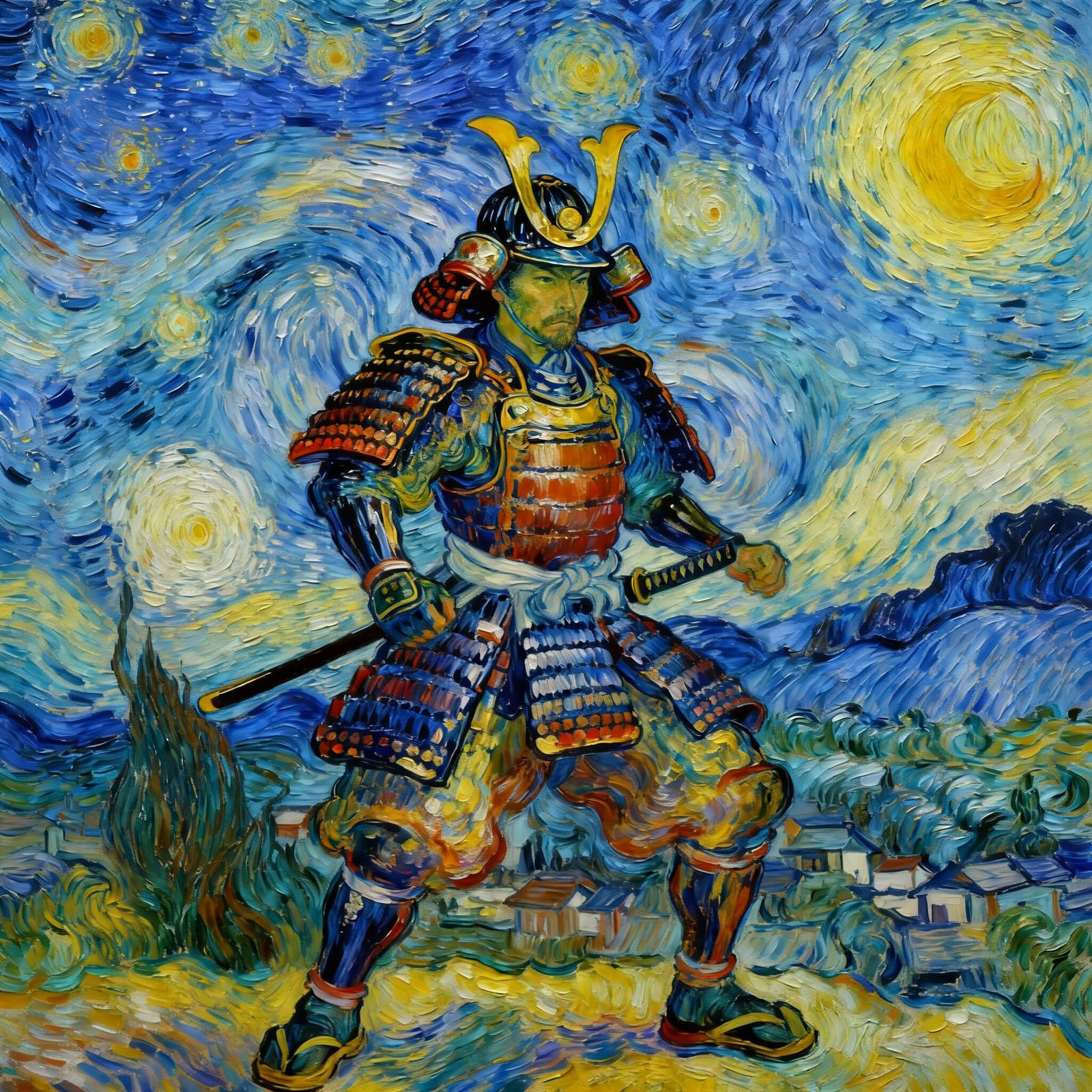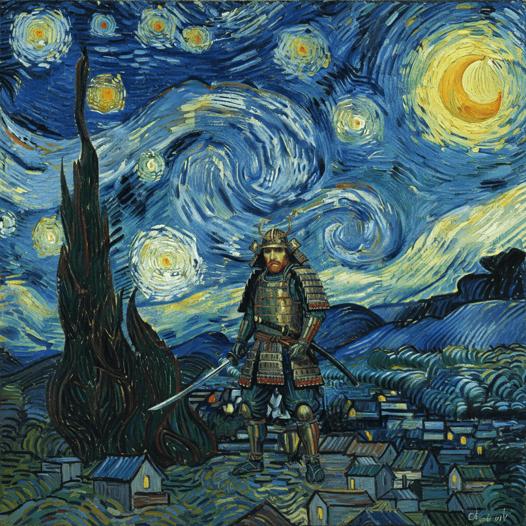 a samurai warrior in Van Gogh’s Starry Night style.