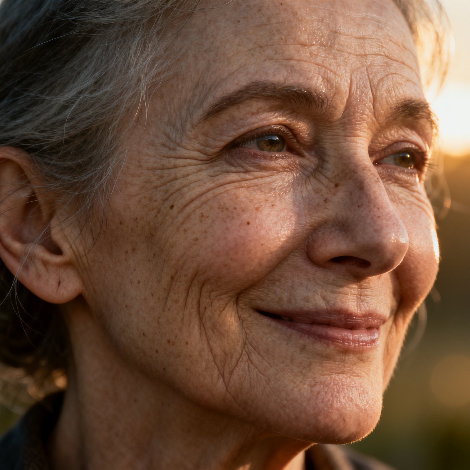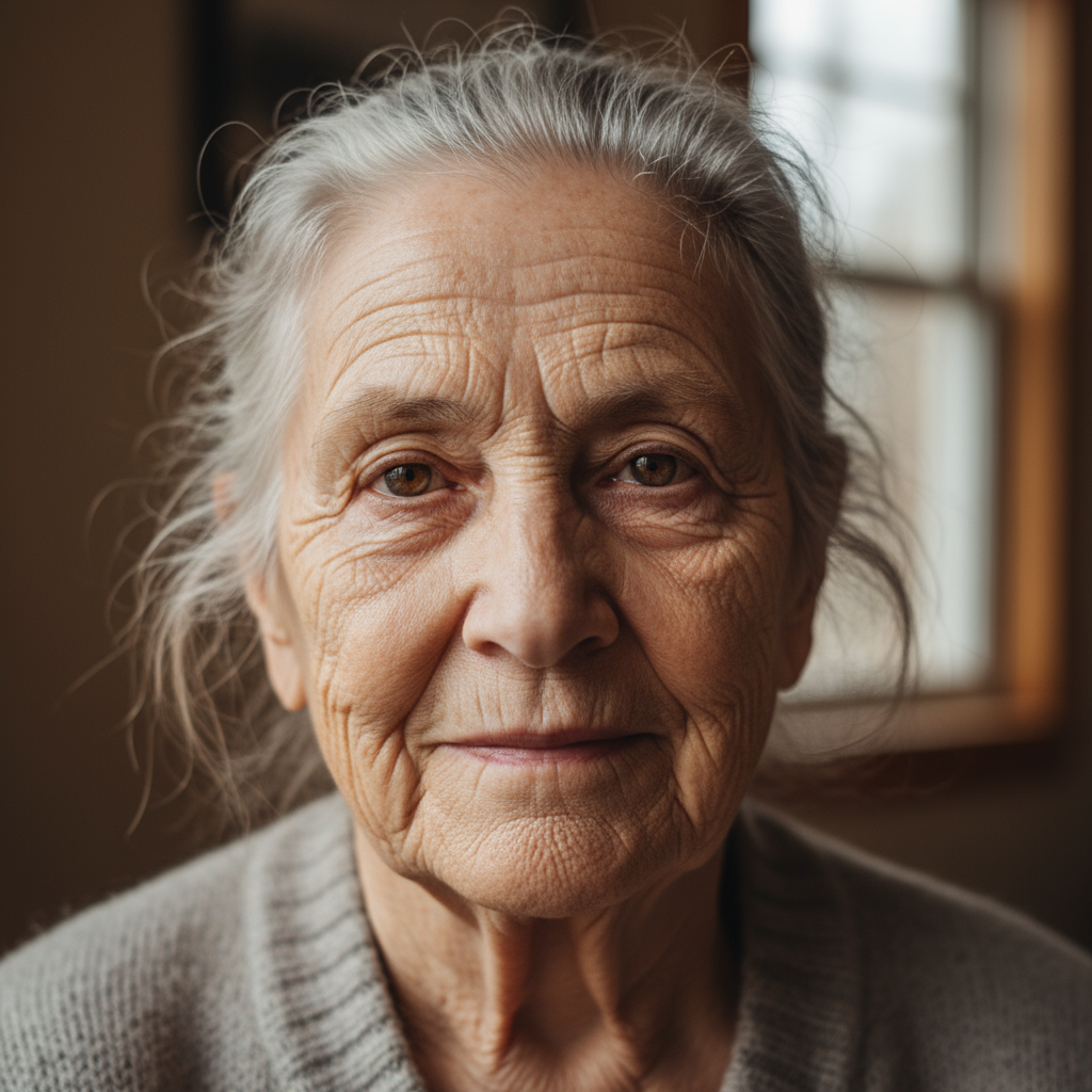 A close-up portrait of an elderly woman with wrinkles, natural light, 8K photorealism.