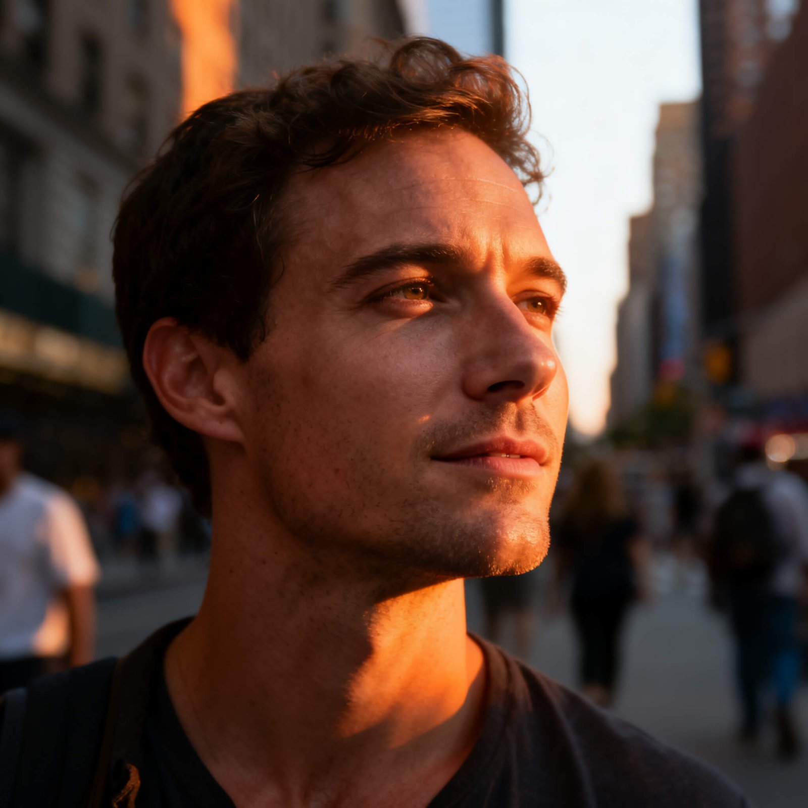 A candid street photo of a man in New York City, golden hour lighting, 4K resolution, realistic skin texture and shadows.”