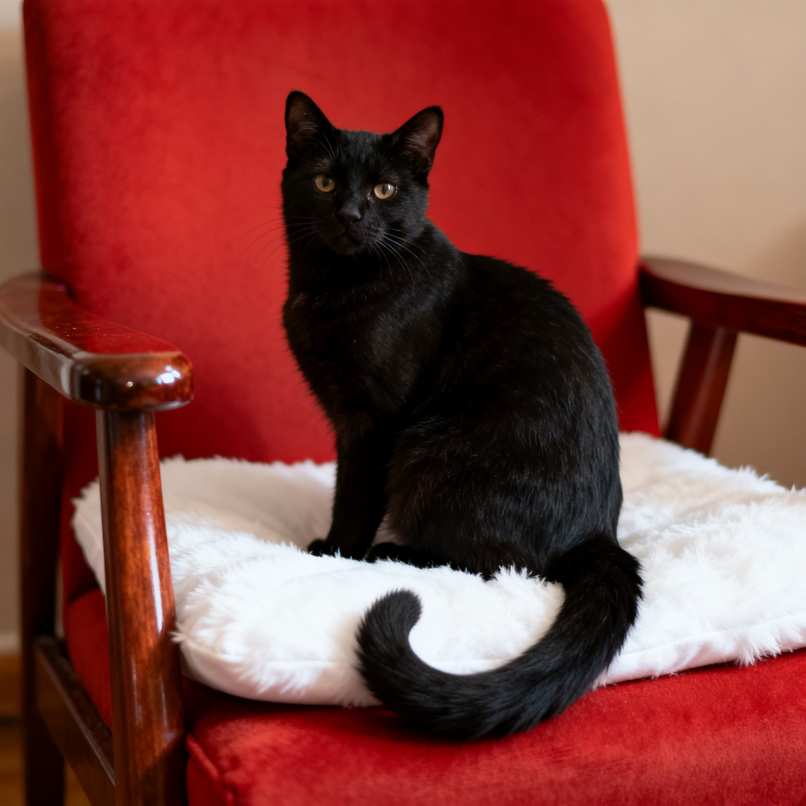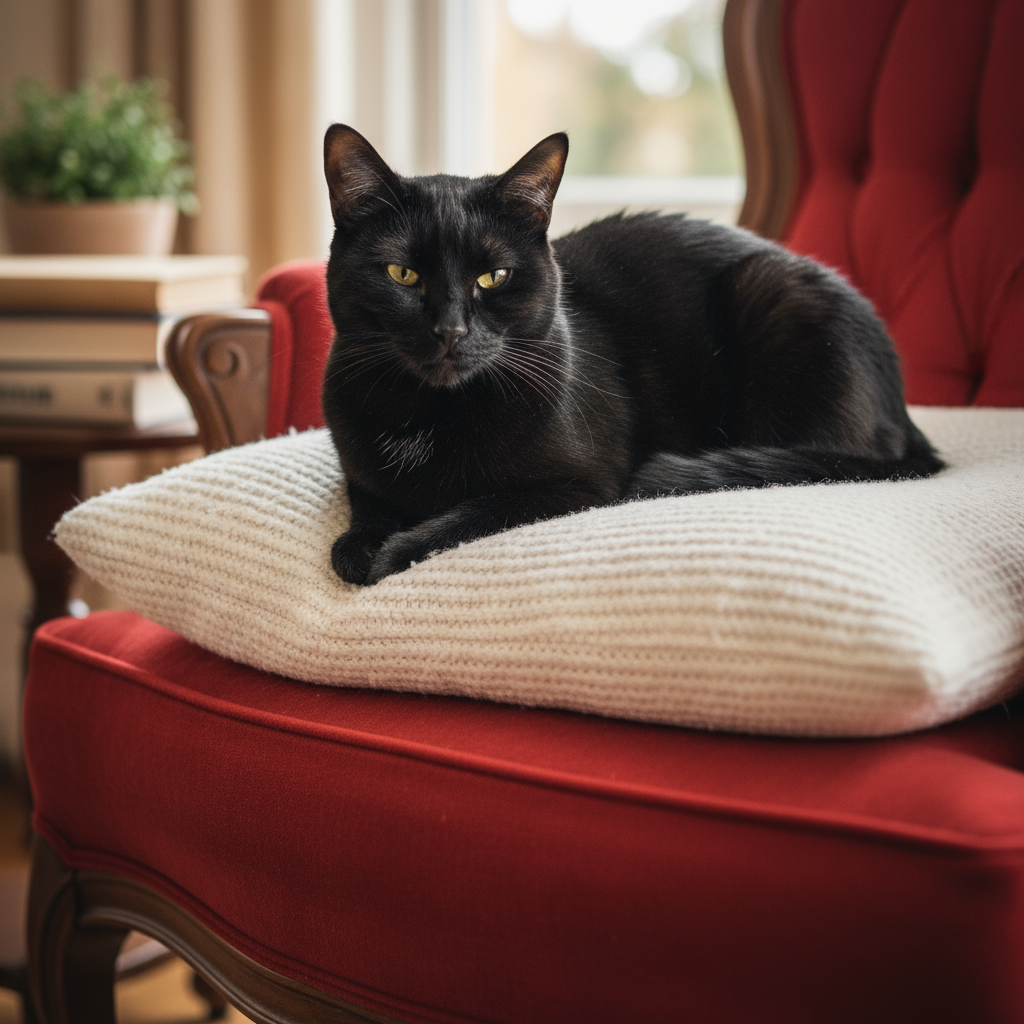 A black cat is sitting on a red chair with a white cushion.