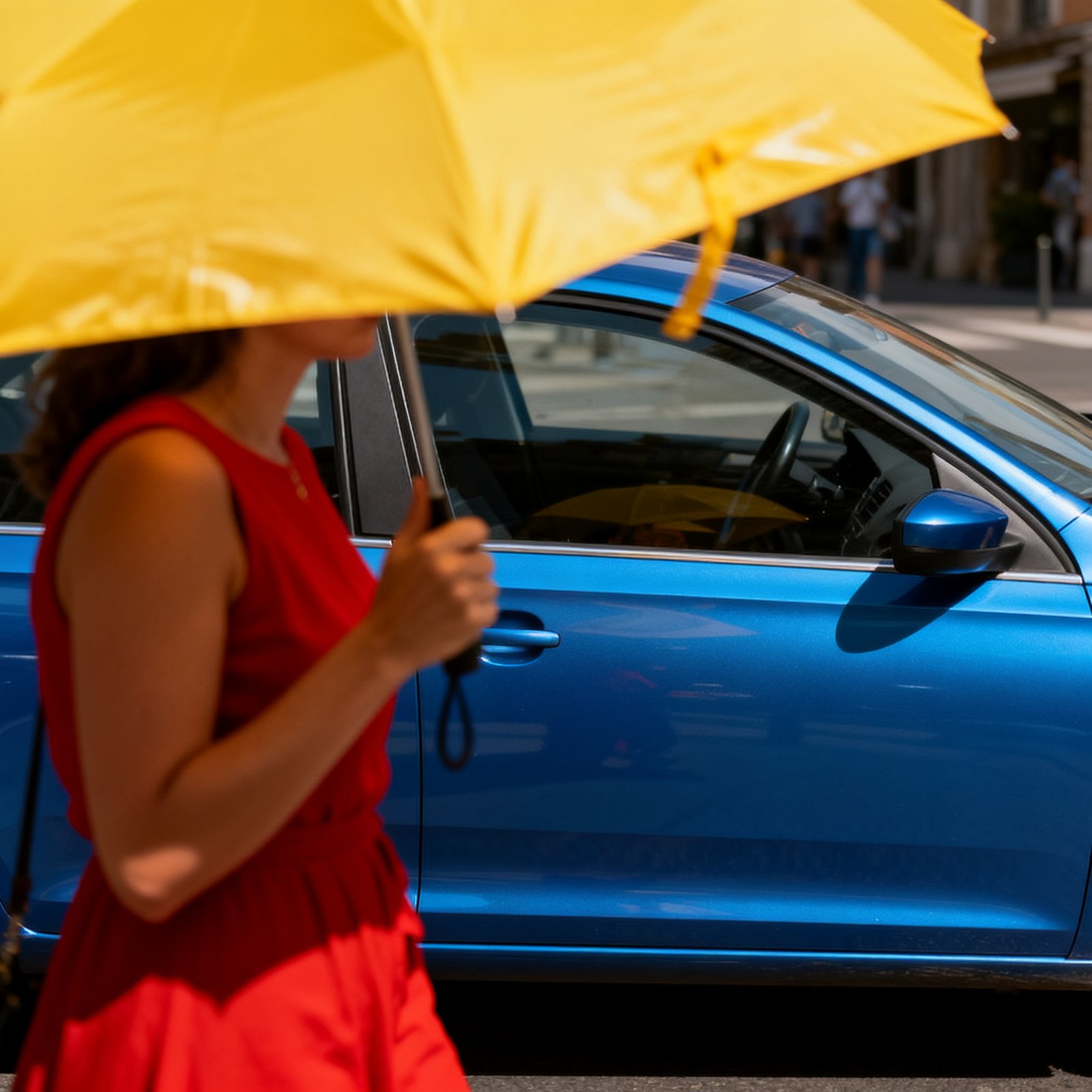 A woman in a red dress holding a yellow umbrella, standing to the left of a blue car
