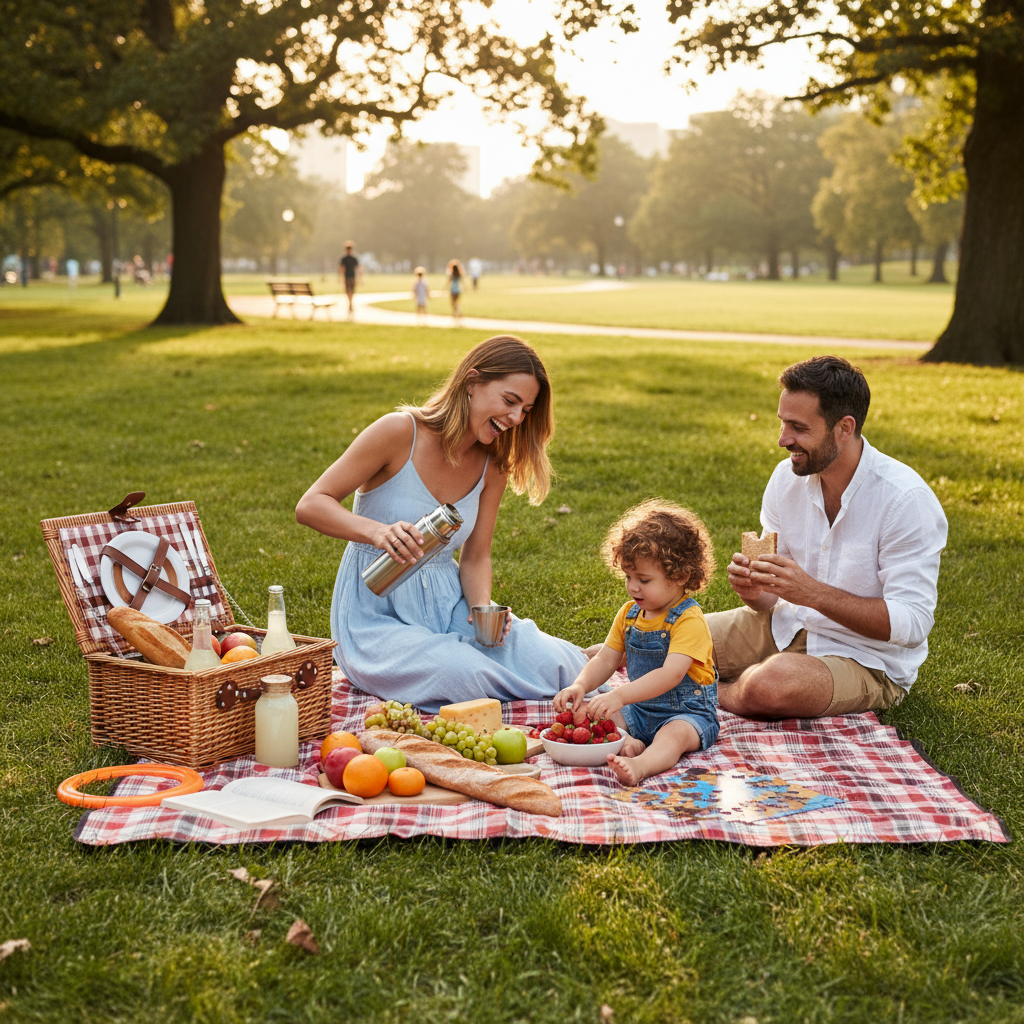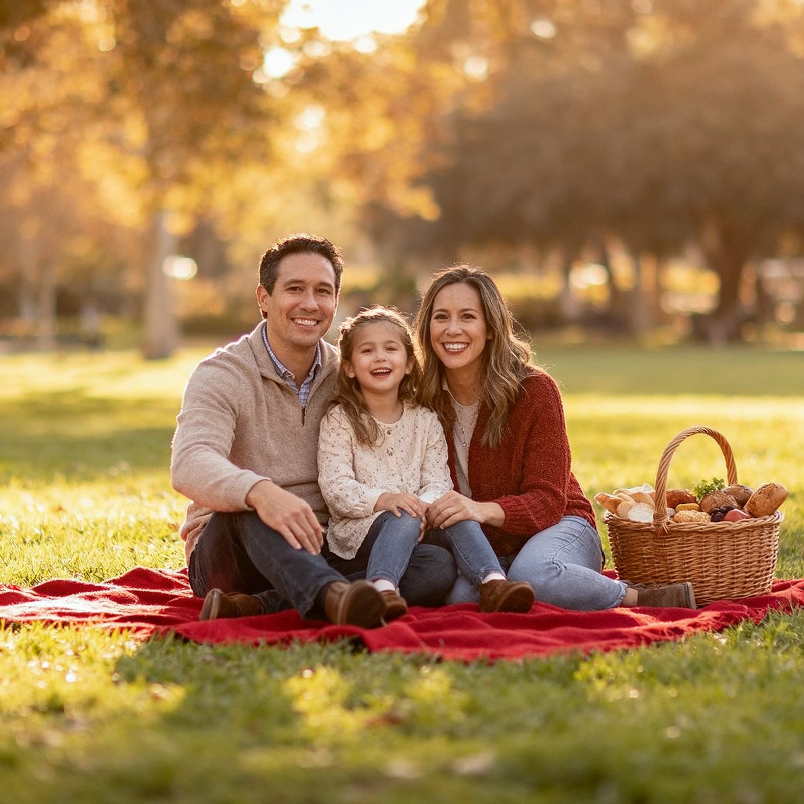A family picnic in a park with three people, a red blanket, and a basket of food.