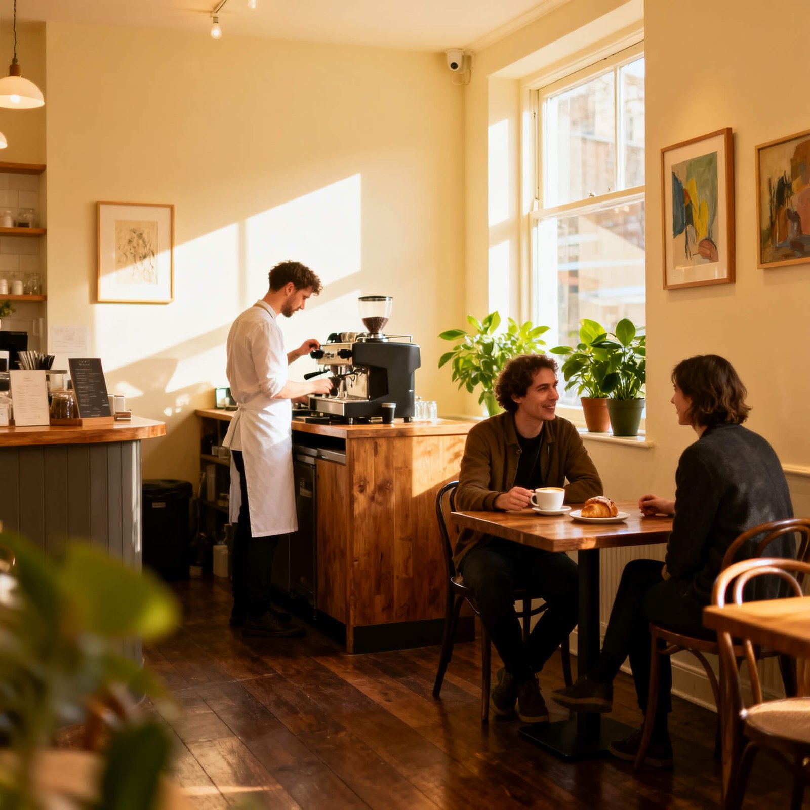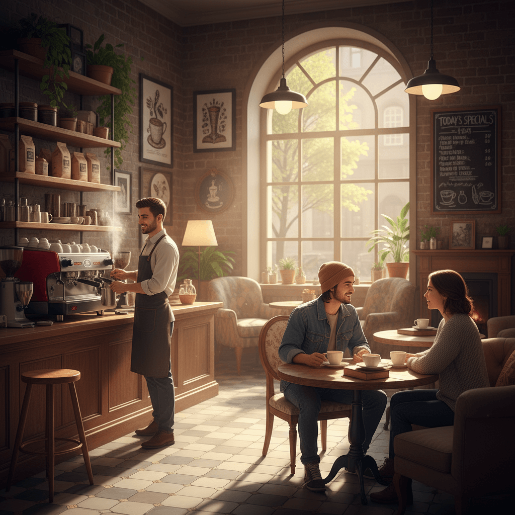 A cozy café interior with a barista making coffee, two customers chatting at a wooden table, sunlight streaming through the window.