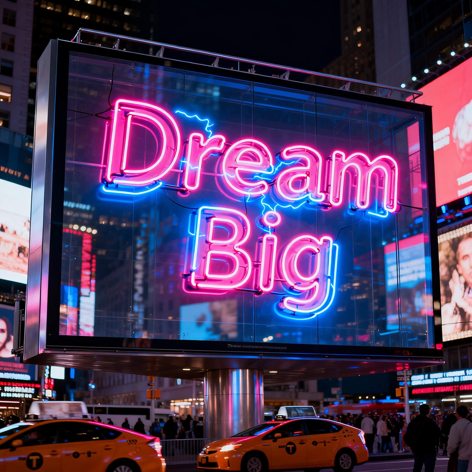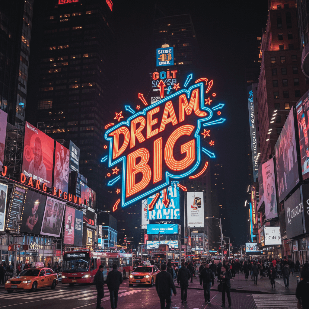 A billboard in Times Square that says ‘Dream Big’ in neon lights, photorealistic style.