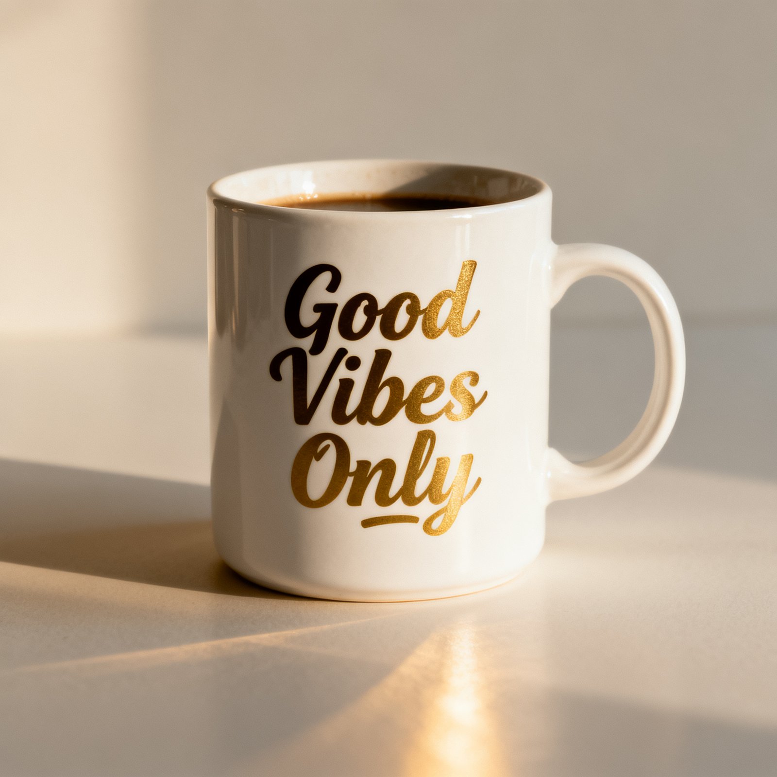 A coffee cup with the words ‘Good Vibes Only’ printed in bold script.